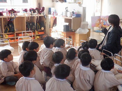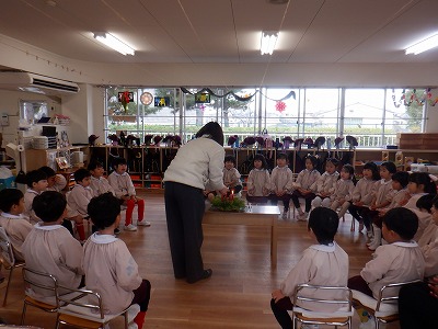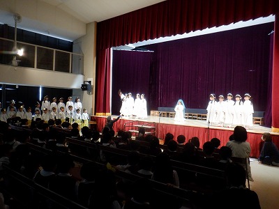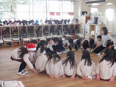 年少・年中組もみんなで劇を楽しみました。キラキラした瞳で拍手し、みんなでクリスマスをお祝い出来ました。