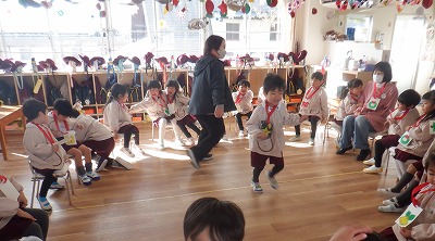 保育室でそれぞれがおもちゃを選んで遊び、皆さんが揃って落ち着かれた頃
