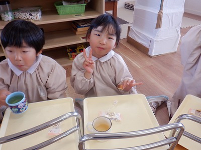 愛餐の意味でカステラとジュースで美味しい嬉しいおやつの時間を過ごしました。