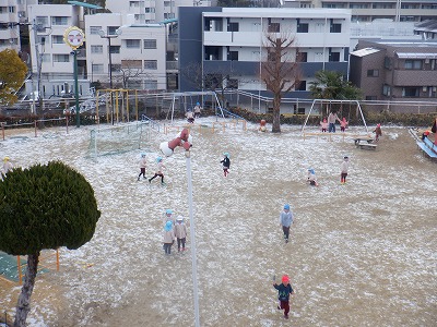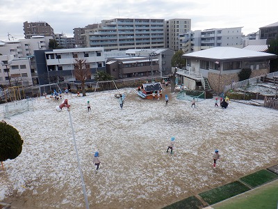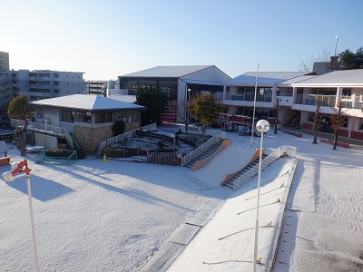 大寒波の朝、珍しく園庭が真っ白になりました。