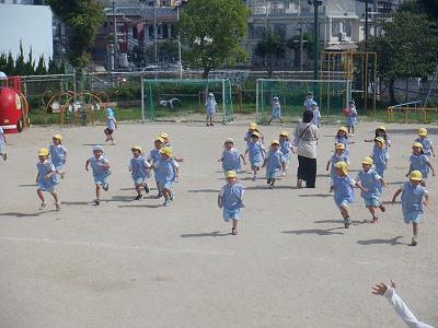 週1回の体操の時間は運動会で披露する種目に年長と年中組は取り組んでいます。