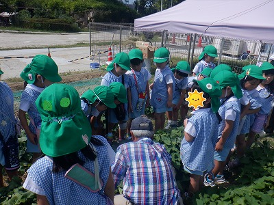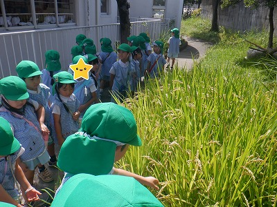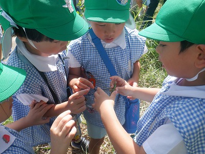 バッタ見つけた! 初めて育てているお米。稲穂がすくすく成長して間もなく収穫です。「これがお米になるんだよ。」とみんな興味津々で観察していました。すると草原に、ぴょんと動くものがいて、捕まえると大きなショウリョウバッタ!!辺りを探してみると、あちらにもこちらにもバッタがいて大興奮でした。